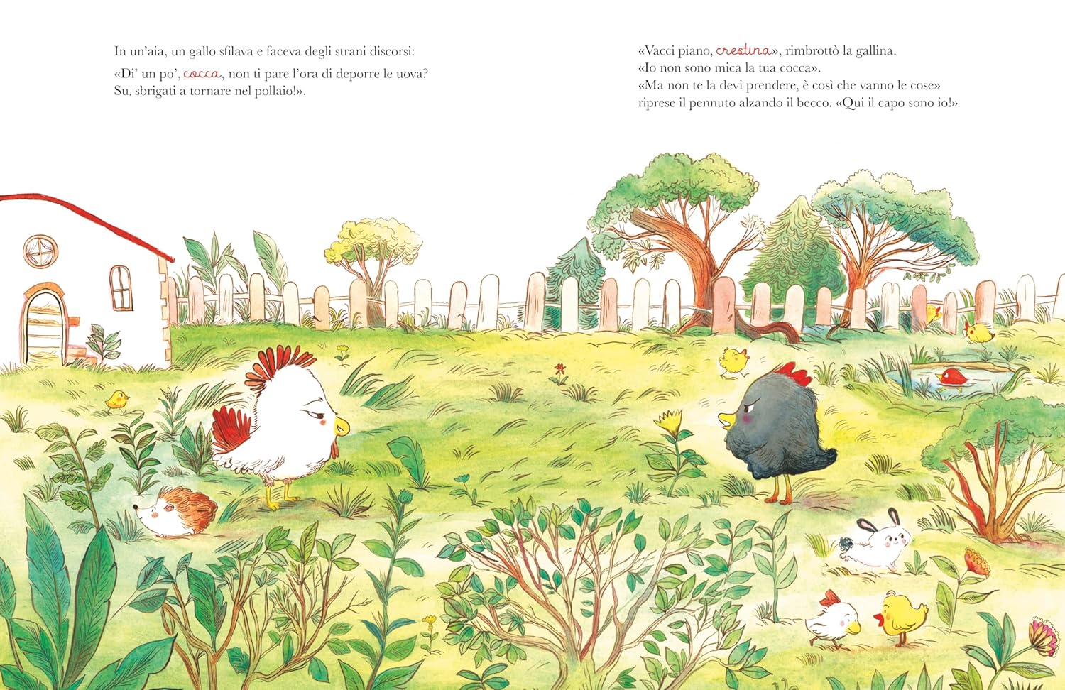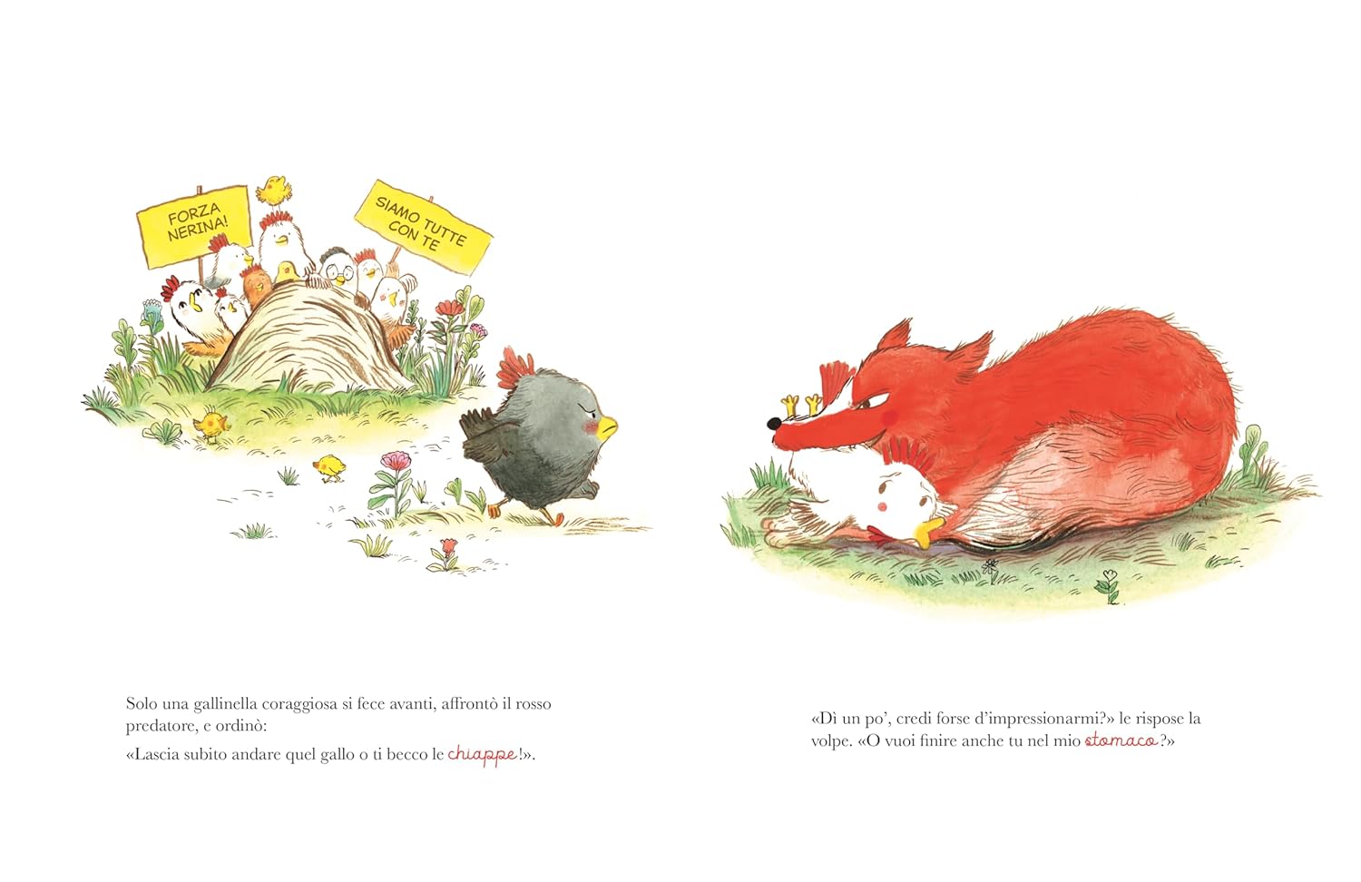 Nel pollaio è sempre la stessa storia: il gallo sfila, canta, prende il posto migliore sul posatoio, si burla delle galline, si abbuffa e lascia solo qualche chicco di grano. Ma un bel giorno la volpe fa capolino dalla foresta e si avvicina minacciosa al cortile. Sarebbe il momento giusto per mostrare di essere un vero leader e invece... il gallo piagnucola impaurito. Sarà la gallina Nerina, stufa delle prepotenze e munita di intrepido coraggio, a prendere in mano la situazione, fare squadra con le compagne, scacciare la volpe e rivendicare uguali diritti per tutti i pennuti. Anche nell'aia è scoccata l'ora della parità! Questo albo pieno di humor e di verve femminista, dall'atmosfera classica e progressista al tempo stesso, conquisterà tutte le lettrici e i lettori che desiderano avere la battuta pronta e una buona dose di carisma, proprio come Nerina. Età di lettura: da 3 anni.