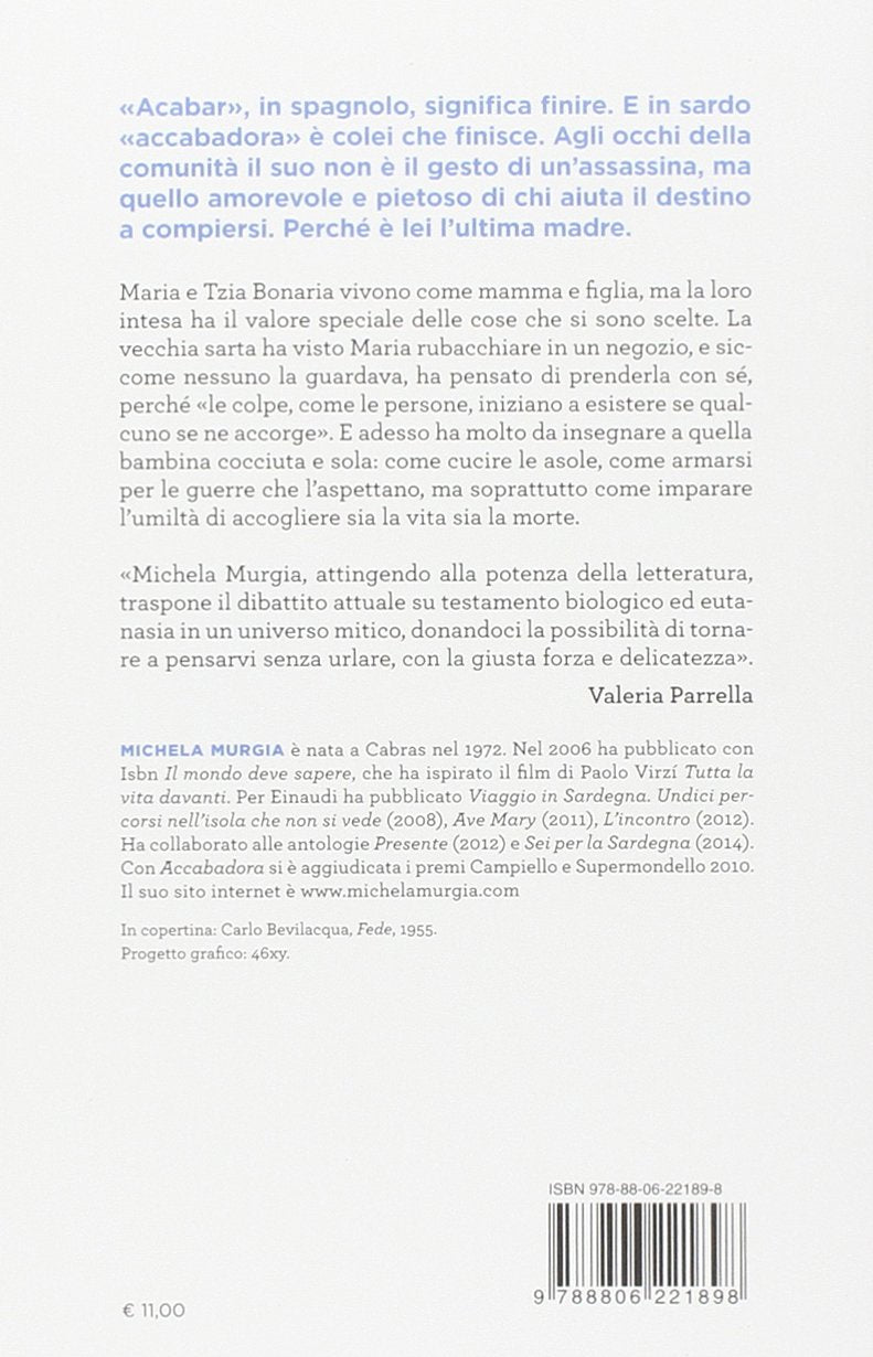 Perché Maria sia finita a vivere in casa di Bonaria Urrai, è un mistero che a Soreni si fa fatica a comprendere. La vecchia e la bambina camminano per le strade del paese seguite da uno strascico di commenti malevoli, eppure è così semplice: Tzia Bonaria ha preso Maria con sé, la farà crescere e ne farà la sua erede, chiedendole in cambio la presenza e la cura per quando sarà lei ad averne bisogno. Quarta figlia femmina di madre vedova, Maria è abituata a pensarsi, lei per prima, come "l'ultima". Per questo non finiscono di sorprenderla il rispetto e le attenzioni della vecchia sarta del paese, che le ha offerto una casa e un futuro, ma soprattutto la lascia vivere e non sembra desiderare niente al posto suo. "Tutt'a un tratto era come se fosse stato sempre così, anima e fili'e anima, un modo meno colpevole di essere madre e figlia". Eppure c'è qualcosa in questa vecchia vestita di nero e nei suoi silenzi lunghi, c'è un'aura misteriosa che l'accompagna, insieme a quell'ombra di spavento che accende negli occhi di chi la incontra. Ci sono uscite notturne che Maria intercetta ma non capisce, e una sapienza quasi millenaria riguardo alle cose della vita e della morte. Quello che tutti sanno e che Maria non immagina, è che Tzia Bonaria Urrai cuce gli abiti e conforta gli animi, conosce i sortilegi e le fatture, ma quando è necessario è pronta a entrare nelle case per portare una morte pietosa. Il suo è il gesto amorevole e finale dell'accabadora, l'ultima madre.Perché Maria sia finita a vivere in casa di Bonaria Urrai, è un mistero che a Soreni si fa fatica a comprendere. La vecchia e la bam
