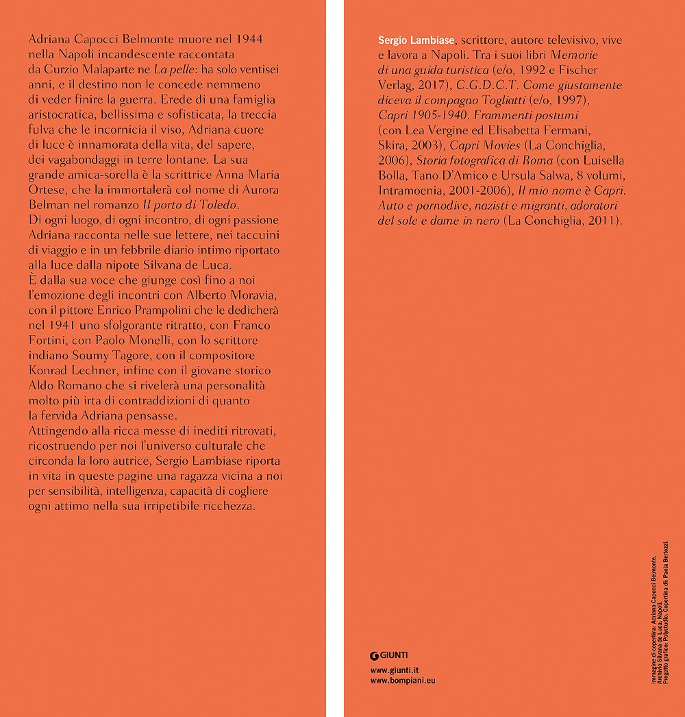 Adriana Capocci Belmonte muore nel 1944 nella Napoli incandescente raccontata da Curzio Malaparte ne "La pelle": ha solo ventisei anni, e il destino non le concede nemmeno di veder finire la guerra. Erede di una famiglia aristocratica, bellissima e sofisticata, la treccia fulva che le incornicia il viso, Adriana cuore di luce è innamorata della vita, del sapere, dei vagabondaggi in terre lontane. La sua grande amica-sorella è la scrittrice Anna Maria Ortese, che la immortalerà col nome di Aurora Belman nel romanzo "Il porto di Toledo". Di ogni luogo, di ogni incontro, di ogni passione Adriana racconta nelle sue lettere, nei taccuini di viaggio e in un febbrile diario intimo riportato alla luce dalla nipote Silvana de Luca. È dalla sua voce che giunge così fino a noi l'emozione degli incontri con Alberto Moravia, con il pittore Enrico Prampolini che le dedicherà nel 1941 uno sfolgorante ritratto, con Franco Fortini, con Paolo Monelli, con lo scrittore indiano Soumy Tagore, con il compositore Konrad Lechner, infine con il giovane storico Aldo Romano che si rivelerà una personalità molto più irta di contraddizioni di quanto la fervida Adriana pensasse. Attingendo alla ricca messe di inediti ritrovati, ricostruendo per noi l'universo culturale che circonda la loro autrice, Sergio Lambiase riporta in vita in queste pagine una ragazza vicina a noi per sensibilità, intelligenza, capacità di cogliere ogni attimo nella sua irripetibile ricchezza.