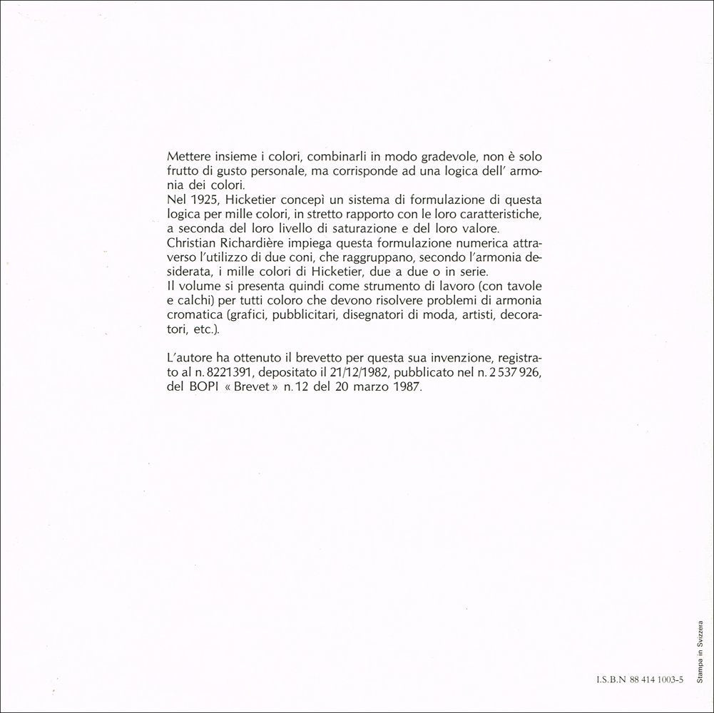 Il volume si presenta come strumento di lavoro (con tavole e calchi) per tutti coloro che devono risolvere problemi di armonia cromatica (grafici, pubblicitari, disegnatori di moda, artisti, decoratori, etc.).