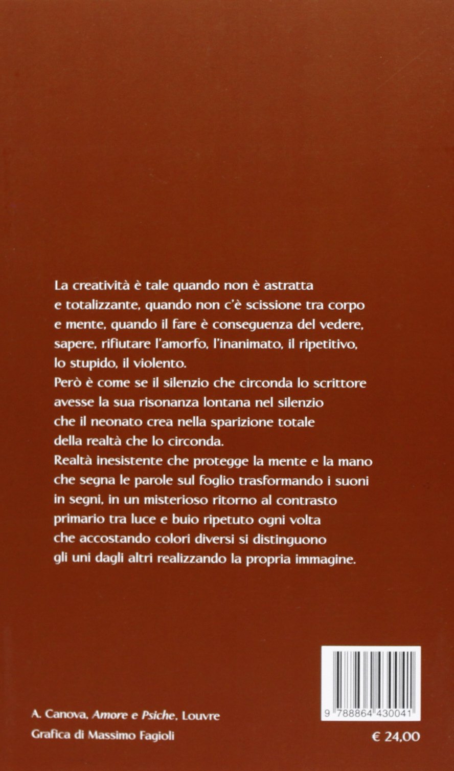 La creatività è tale quando non è astratta e totalizzante, quando non c'è scissione tra corpo e mente, quando il fare è conseguenza del vedere, sapere, rifiutare l'amorfo, l'inanimato, il ripetitivo, lo stupido, il violento. Però è come se il silenzio che circonda lo scrittore avesse la sua risonanza lontana nel silenzio che il neonato crea nella sparizione totale della realtà che lo circonda. Realtà inesistente che protegge la mente e la mano che segna le parole sul foglio trasformando i suoni in segni, in un misterioso ritorno al contrasto primario tra luce e buio ripetuto ogni volta che accostando colori diversi si distinguono gli uni dagli altri realizzando la propria immagine.