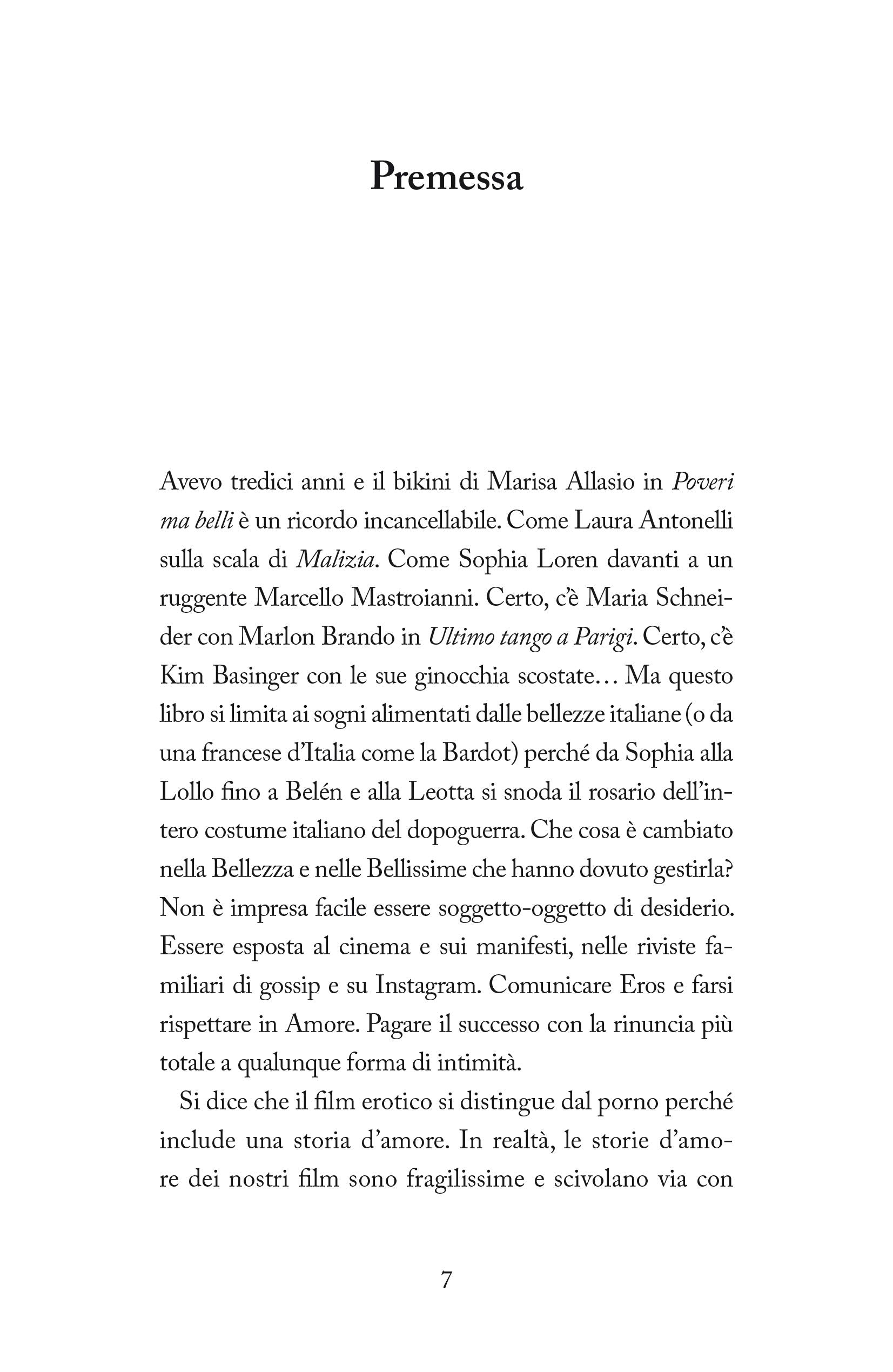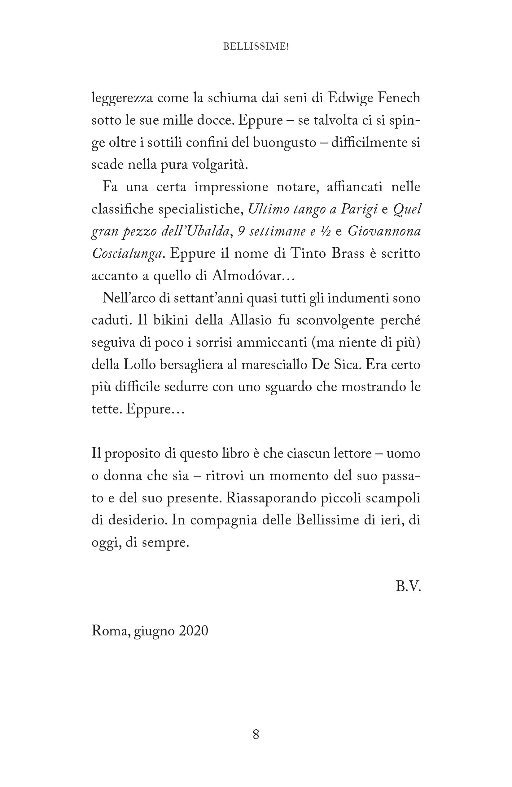 Che cosa unisce Gina Lollobrigida a Diletta Leotta, Sophia Loren a Valeria Marini, Claudia Cardinale a Marisa Allasio, Laura Antonelli a Belén, le sorelle Kessler a Edwige Fenech? La capacità di sedurre. Seduzione non è necessariamente fascino. Certamente è attrazione. Fonte di sogni e di fantasie. Bellissime! è una cavalcata in sei tappe e diciotto storie attraverso settant'anni di seduzioni. Dal cinema in bianco e nero, con le sue raffinatissime sfumature di toni al colore che fece esplodere la sensualità fino alla sfacciataggine. Certo, Edwige Fenech è stata l'attrice più insaponata della storia, ma a Sophia Loren e Laura Antonelli bastò un gioco di calze per far impazzire il pubblico. E negli anni '70 un popolo intero di maschi fissò la sua agenda erotica al sabato sera per veder comparire le gambe delle Kessler. Oggi chi vuole ha la seduzione in tasca. Invece di telefonare guarda, ingrandisce, chatta. Il prossimo passo?