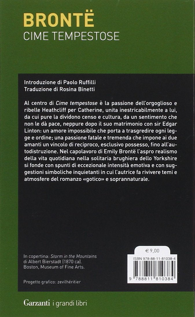 Al centro di "Cime tempestose" è la passione dell'orgoglioso e ribelle Heathcliff per Catherine, unita inestricabilmente a lui, da cui pure la dividono censo e cultura, da un sentimento che non le dà pace, neppure dopo il suo matrimonio con sir Edgar Linton: un amore impossibile che porta a trasgredire ogni legge e ordine; una passione fatale e tremenda che impone ai due amanti un vincolo di reciproco, esclusivo possesso, fino all'autodistruzione. Nel capolavoro di Emily Brontë l'aspro realismo della vita quotidiana nella solitaria brughiera dello Yorkshire si fonde con spunti di eccezionale intensità emotiva e con suggestioni simboliche inquietanti in cui l'autrice fa rivivere temi e atmosfere del romanzo "gotico" e soprannaturale. Introduzione di Paolo Ruffilli.