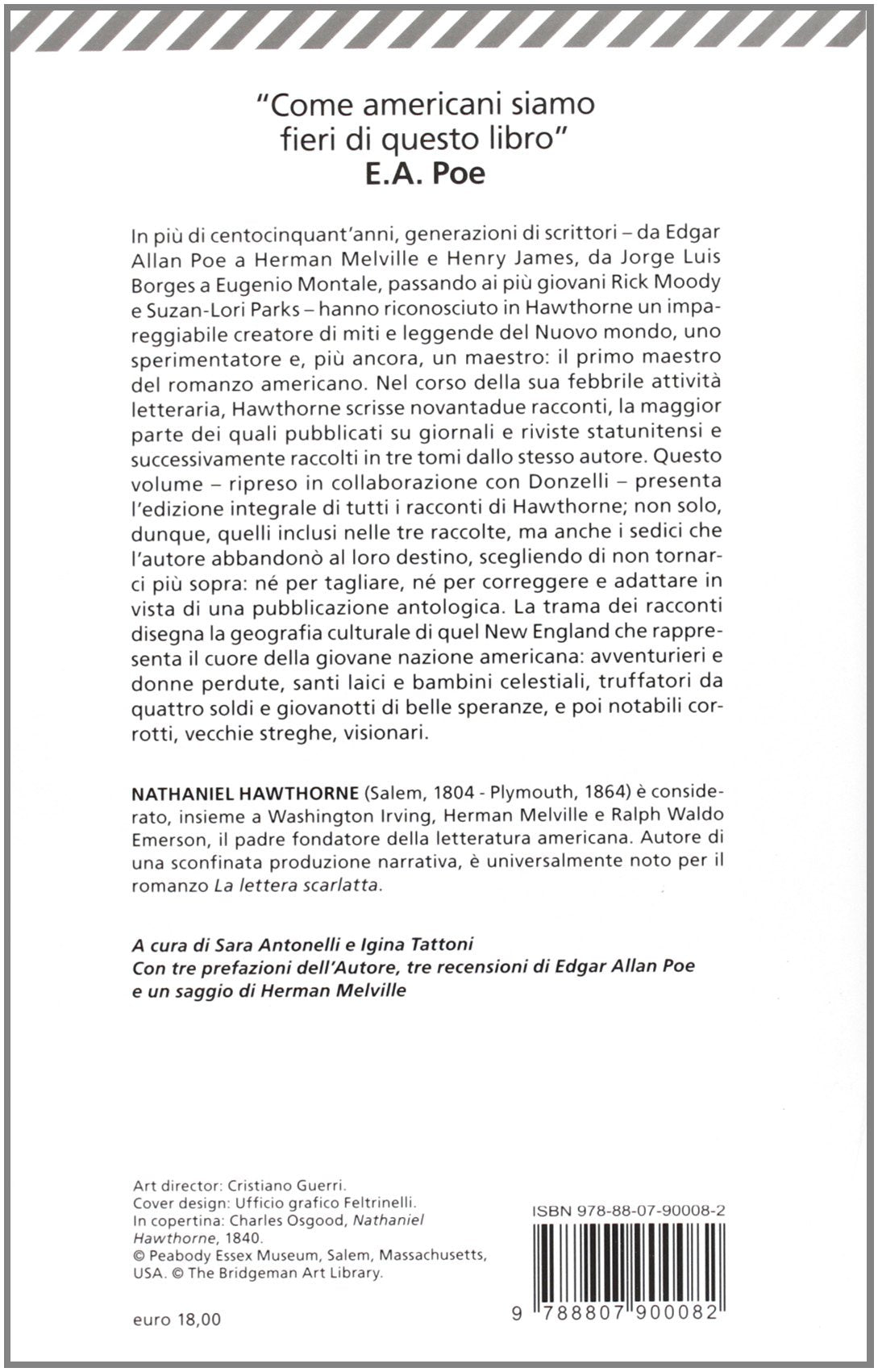 In più di centocinquant'anni, generazioni di scrittori - da edgar allan poe a herman melville e henry james, da jorge luis borges a eugenio montale, passando ai più giovani rick moody e suzan-lori parks - hanno riconosciuto in hawthorne un impareggiabile creatore di miti e leggende del nuovo mondo, uno sperimentatore e, più ancora, un maestro: il primo maestro del romanzo americano. nel corso della sua febbrile attività letteraria, hawthorne scrisse novantadue racconti, la maggior parte dei quali pubblicati su giornali e riviste statunitensi e successivamente raccolti in tre tomi dallo stesso autore. questo volume, ripreso in collaborazione con donzelli, presenta l'edizione integrale di tutti i racconti di hawthorne; non solo, dunque, quelli inclusi nelle tre raccolte, ma anche i sedici che l'autore abbandonò al loro destino, scegliendo di non tornarci più sopra: né per tagliare, né per correggere e adattare in vista di una pubblicazione antologica. la trama dei racconti disegna la geografia culturale di quel new england che rappresenta il cuore della giovane nazione americana: avventurieri e donne perdute, santi laici e bambini celestiali, truffatori da quattro soldi e giovanotti di belle speranze, e poi notabili corrotti, vecchie streghe, visionari. con tre prefazioni dell'autore, tre recensioni di edgar allan poe e un saggio di herman melville.