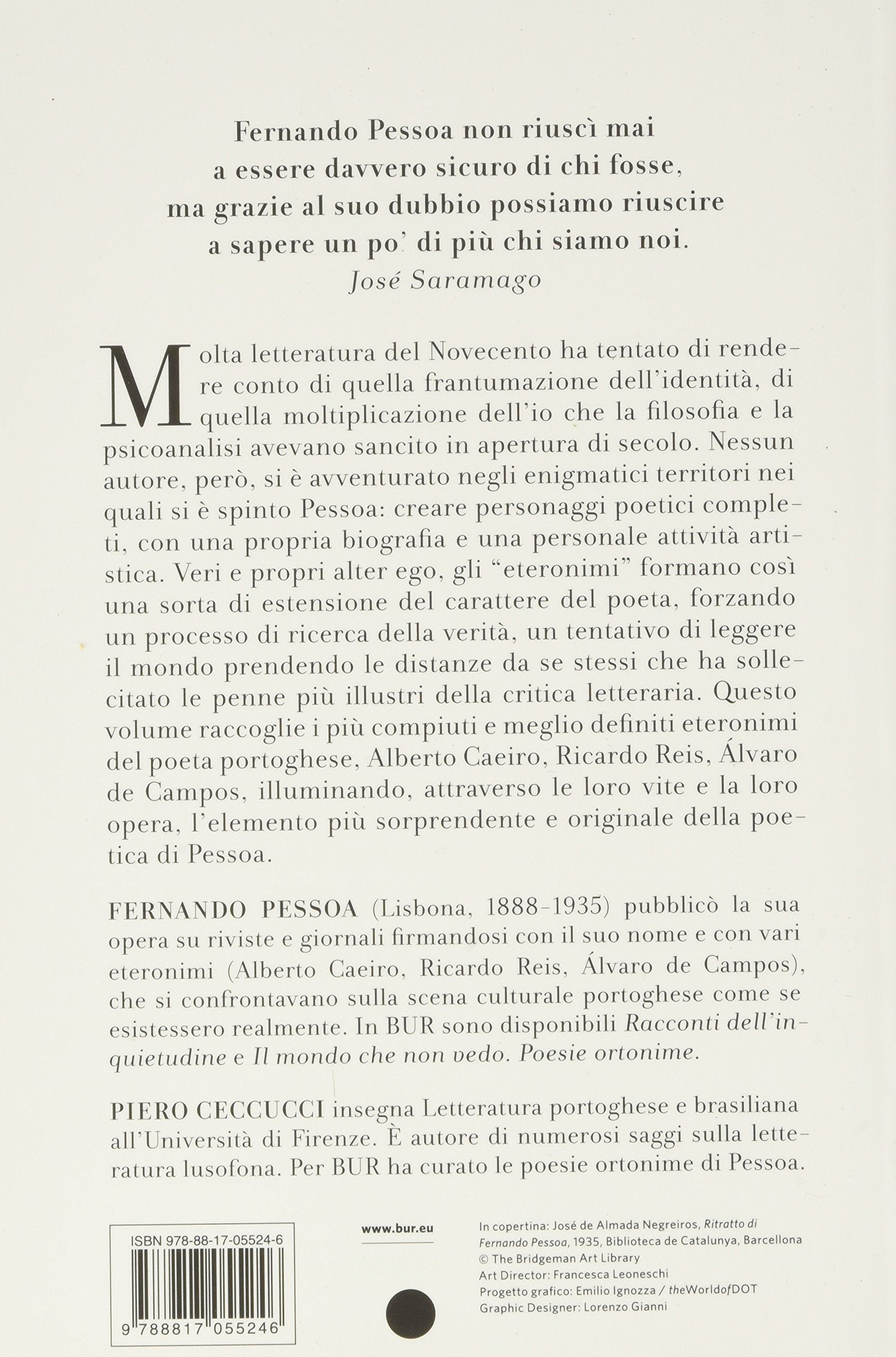 Molta letteratura del Novecento ha tentato di rendere conto di quella frantumazione dell'identità, di quella moltiplicazione dell'io che la filosofia e la psicoanalisi avevano sancito in apertura di secolo. Nessun autore, però, si è avventurato negli enigmatici territori nei quali si è spinto Pessoa: creare personaggi poetici completi, con una propria biografia e una personale attività artistica. Veri e propri alter ego, gli "eteronimi" formano così una sorta di estensione del carattere del poeta, forzando un processo di ricerca della verità, un tentativo di leggere il mondo prendendo le distanze da se stessi che ha sollecitato le penne più illustri della critica letteraria. Questo volume raccoglie i più compiuti e meglio definiti eteronimi del poeta portoghese, Alberto Caeiro, Ricardo Reis, Alvaro de Campos, illuminando, attraverso le loro vite e la loro opera, l'elemento più sorprendente e originale della poetica di Pessoa.